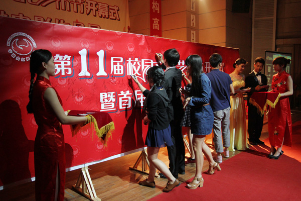 开幕式在耀眼的闪光灯和现场热烈的掌声中拉开序幕,到场的领导、微电影指导老师、入选微电影主创人员等纷纷走上红地毯并签名留影。